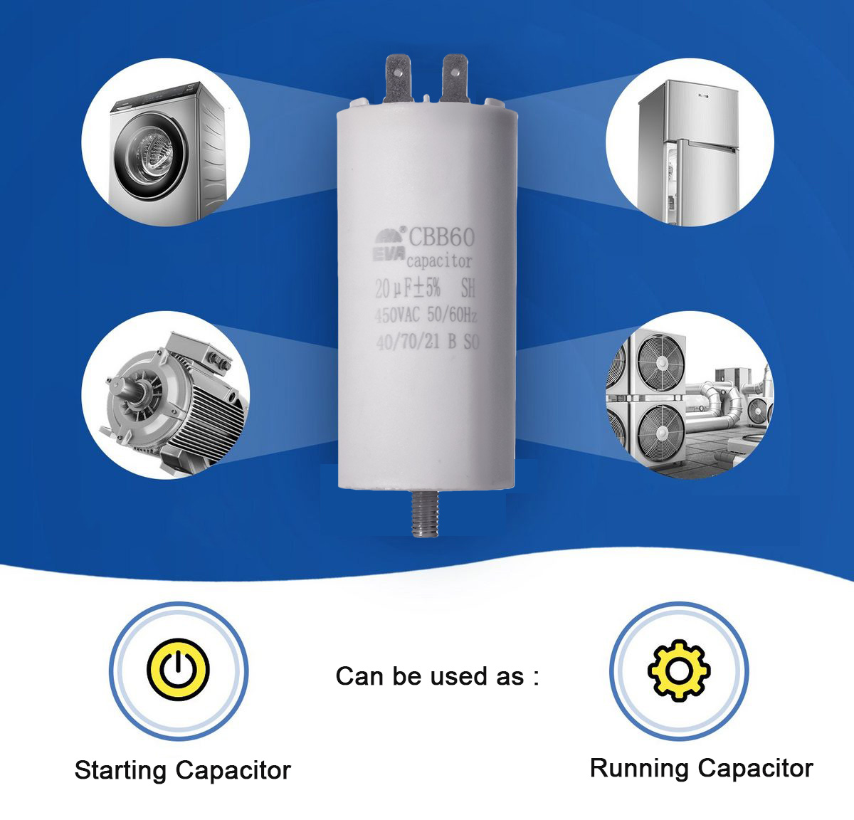 A:According to customers’ different installation methods on products, EVA-capacitor can provide the following capacitor styles. EVA-ac motor capacitors are used for starting, running and adjusting speed. EVA-Capacitor are widely applied in table tans, floor fans, ceiling fans, wall fans, luxury ceiling fans, exhaust fans, extractor fans, heater, smash paper machine, turbine, dehumidifier, etc.